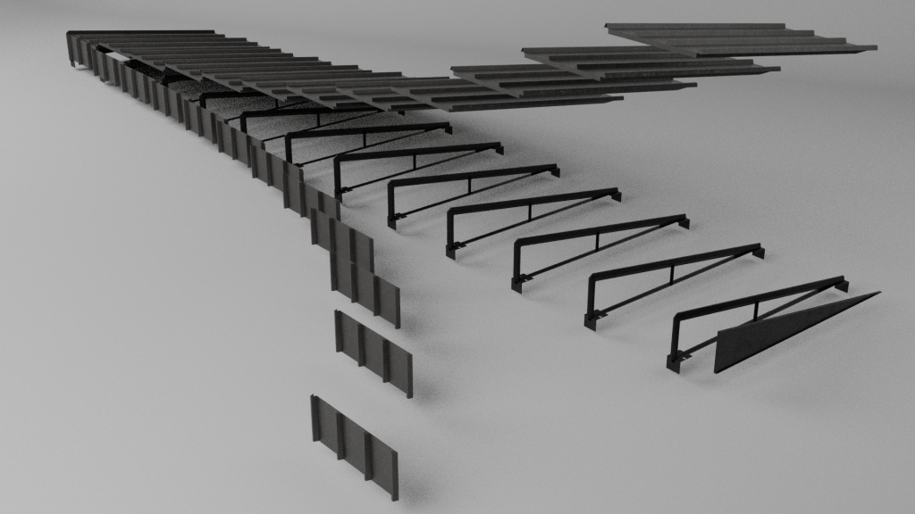 The final concept is a prefabricated SMC roof system compatible with both 20ft and 40ft container homes. It consists of only two SMC components: a repeating structural mounting part and an end cap. These components anchor standardized steel sandwich panels while creating a sloped, sealed, and insulated roof assembly.