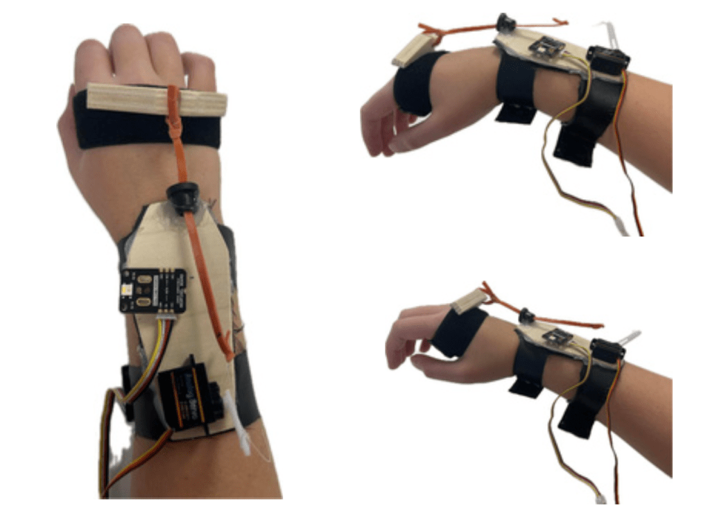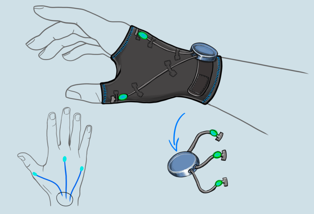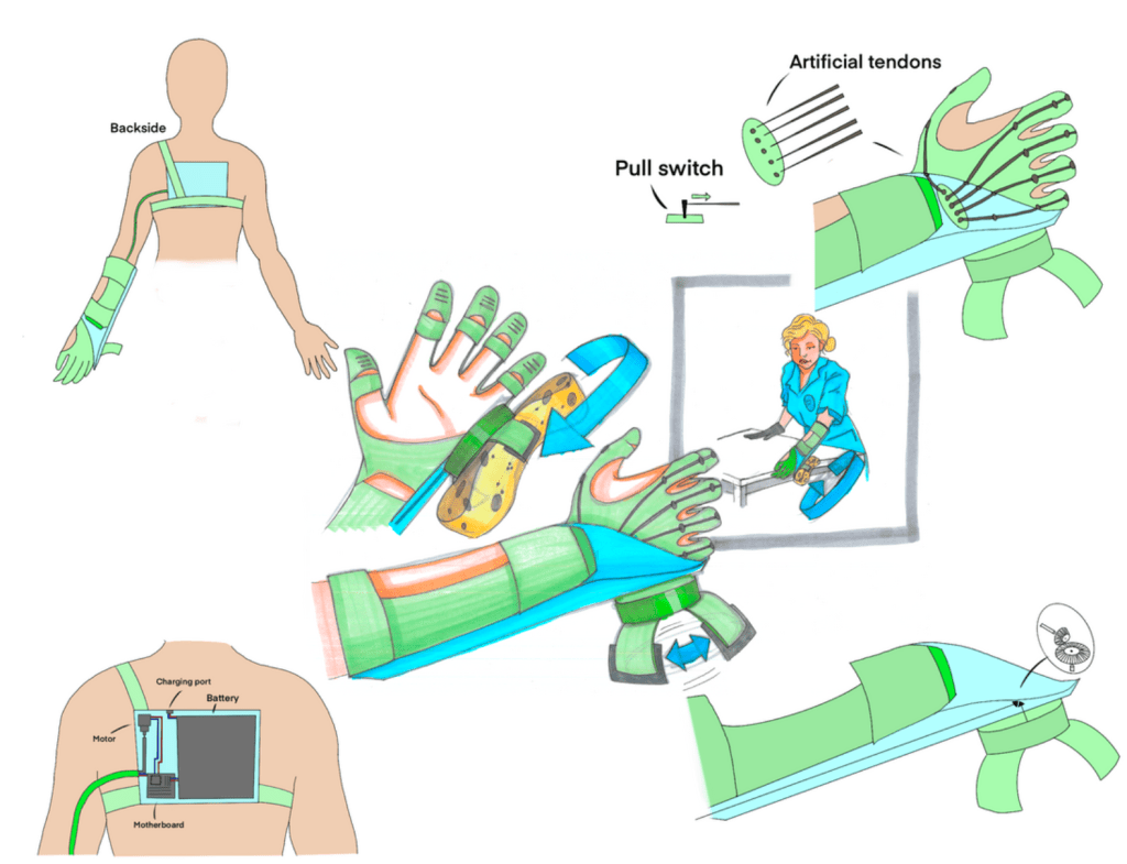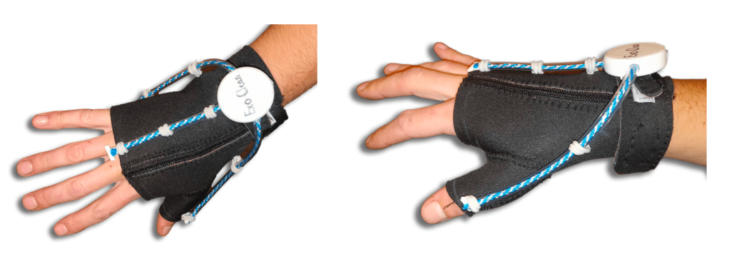 ExoClean is a glove designed for cleaners ment to be worn while working, providing real-time haptic feedback to improve wrist posture and encourage ergonomic movement—helping prevent repetitive strain injuries during daily tasks.